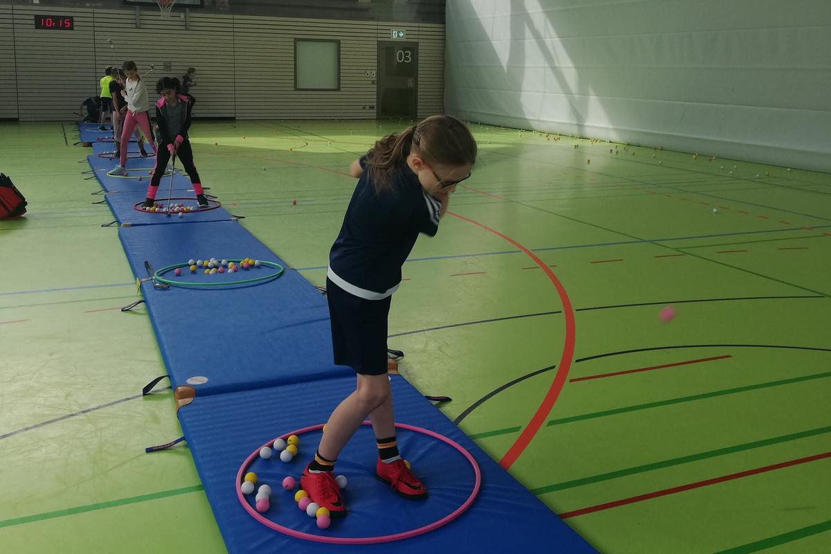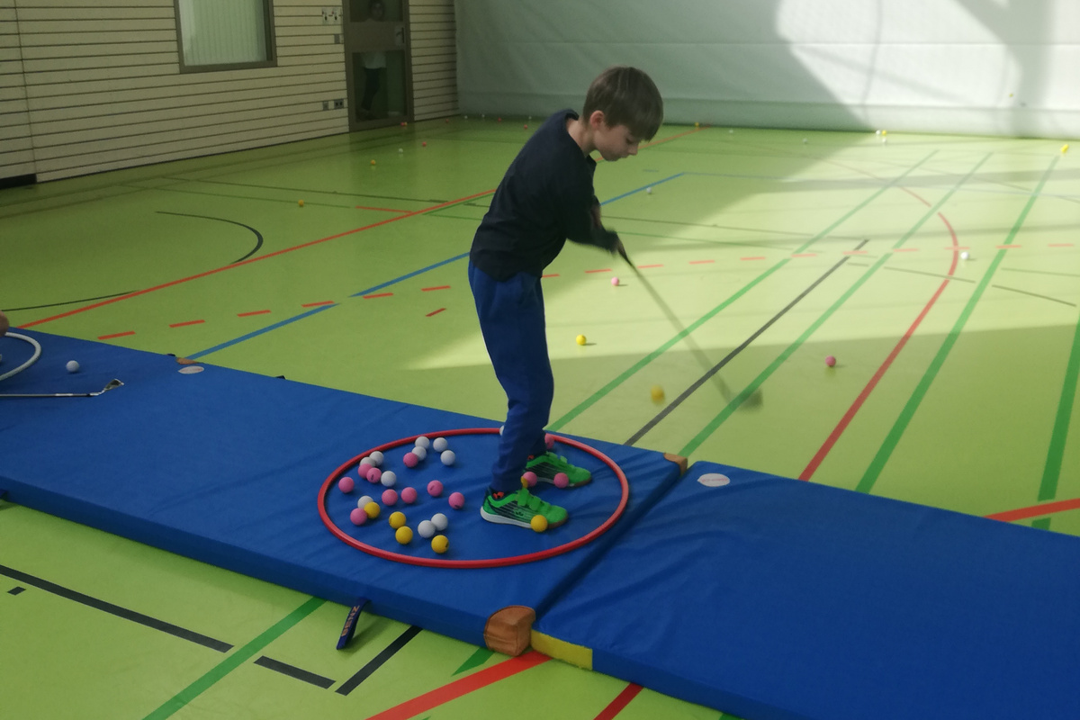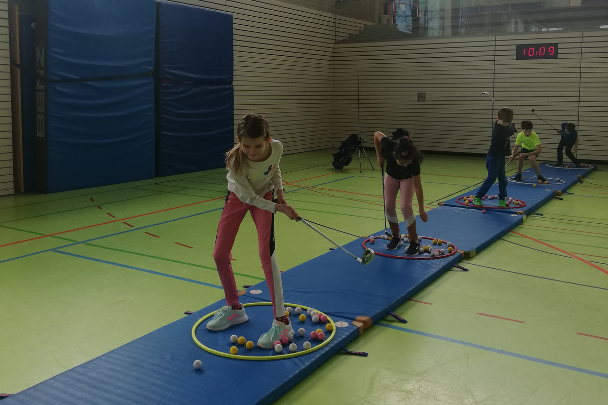 Um die Sportart Golf noch bekannter und attraktiver zu machen, waren vergangene und diese Woche die beiden Golfer Max und Jelto vom Golfclub Bad Liebenzell e.V. bei unseren Zweit- und Drittklässlern im Sportunterricht zu Besuch. Ziel dessen war es, Kinder ohne golfende Eltern an den Golfsport heranzuführen und Talente zu fördern. Wie die Kinder mit Freude und Begeisterung bei der Sache waren, war sehr sehenswert. Mit den kurzen Golfschlägern wurde geübt, was das Zeug hält.