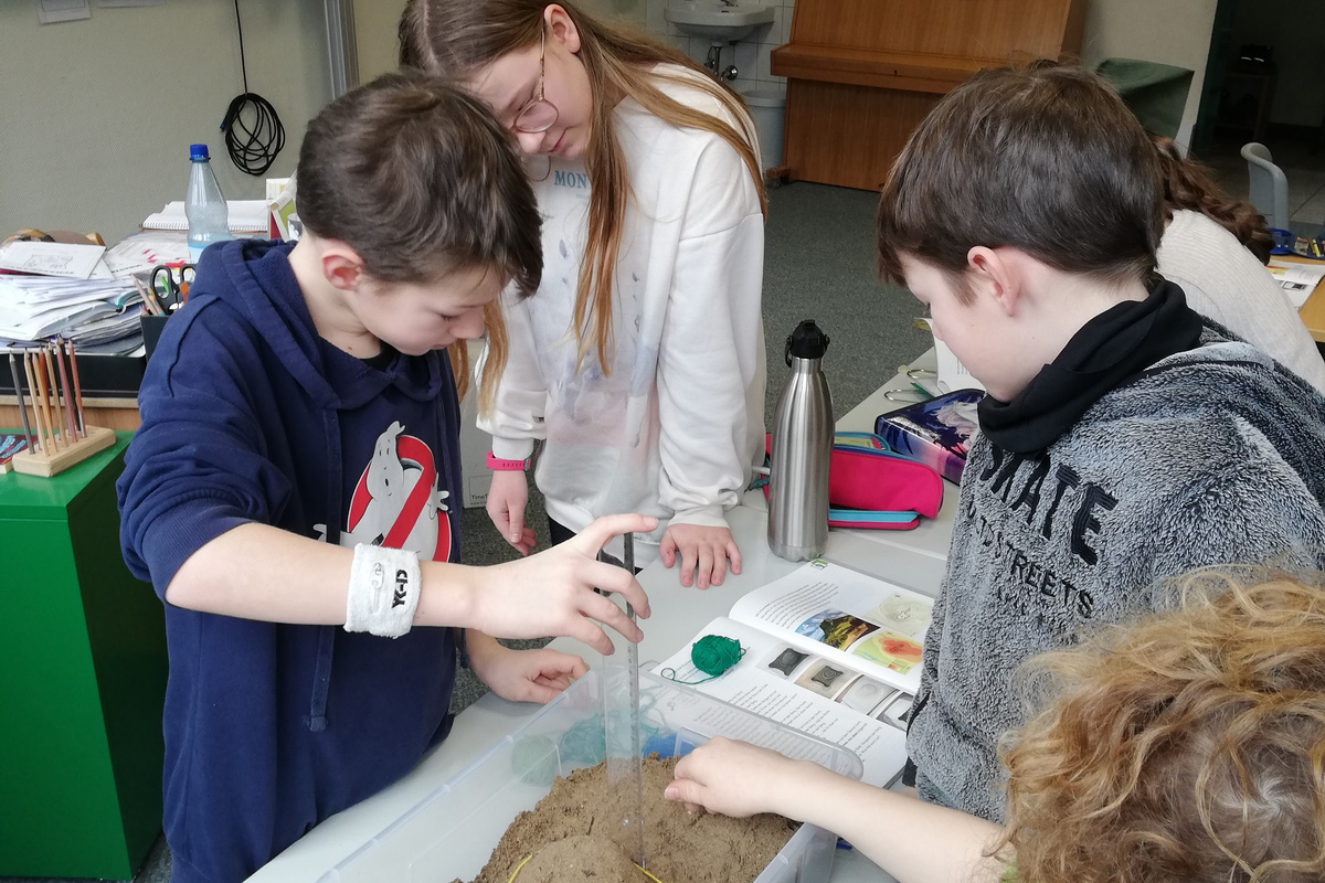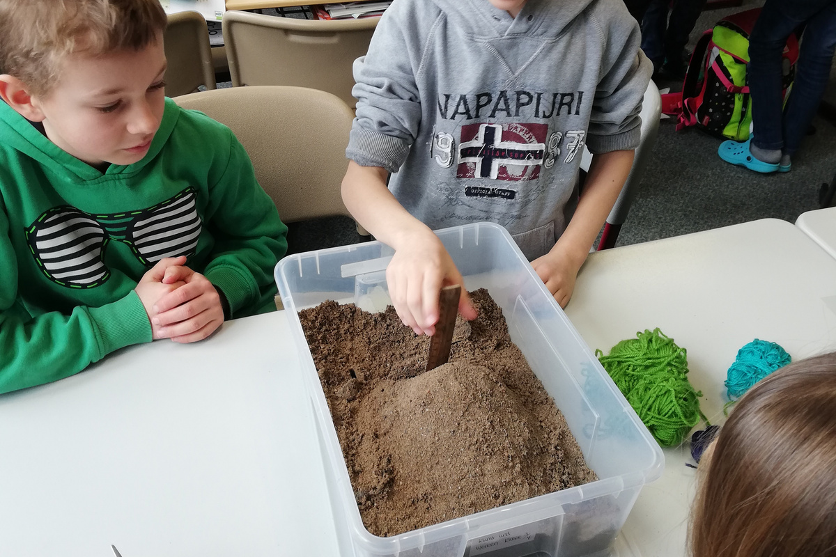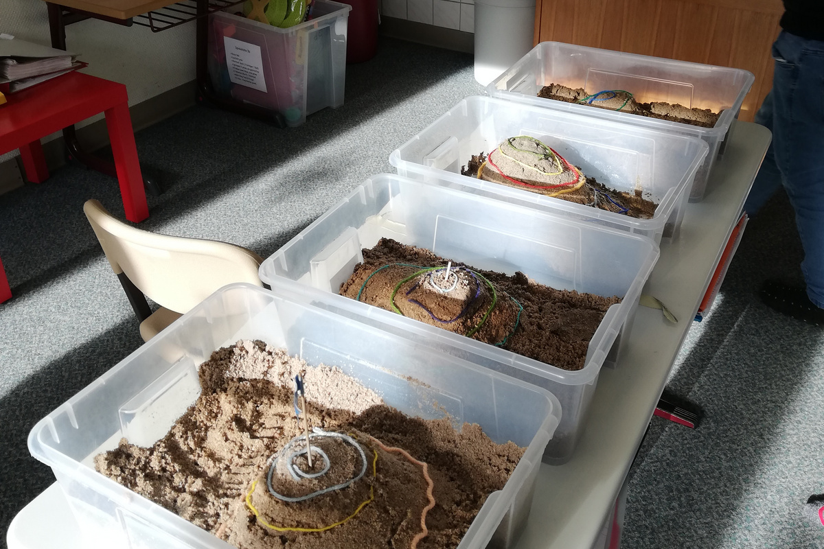 Im Sachunterricht der Klassen 4 in der GS Althengstett wurde diese Frage gruppenweise beantwortet. Zum Thema „Unsere Heimat – unsere Welt“ wurden die Kleingruppen mit jeweils einer Kiste Sand, einem durchsichtigen Deckel, Wolle, einem Lineal, einer Schere, Folienstiften und einem Zahnstocher ausgestattet und gemeinsam ausprobiert wie Höhenlinien entstehen.