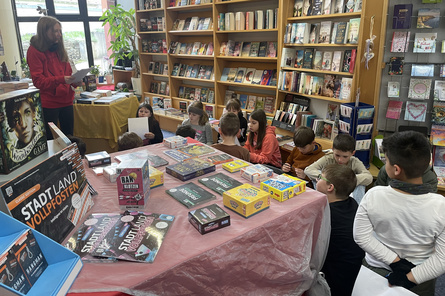 Die Althengstetter Buchhandlung „Prägers Buchlädle“ nahm ebenfalls an der Aktion teil und lud die ViertklässlerInnen mit ihrer jeweiligen Deutsch-Lehrerin ein. Nachdem die Kinder ein Quiz mit Fragen rund um das Thema Bücher lösten, erhielten sie anschließend das Welttagsbuch „Volle Fahrt ins Abenteuer“. Es handelt sich dabei um ein Comicroman, welcher Ende des vierten Schuljahres im Klassenverband gelesen werden soll. Die Klassen 4a und 4b mit Frau Löpke und Frau Höfflin bedanken sich