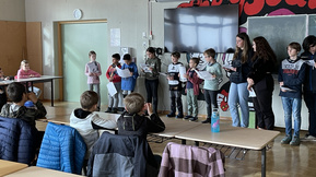 Im Rahmen des Frederick Tags betrachteten die beiden zweiten Klasse außerdem das namengebende Bilderbuch von Leo Lionni, in welchem eine Maus anstelle von Nahrung lieber Sonnenstrahlen, Farben und Wörter für den Winter sammelt und so die Kraft der Fantasie und der Sprache entdeckt.