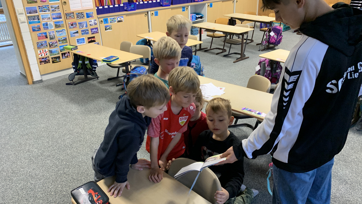 Am Freitag, den 21.10.22 sind einige Schülerinnen und Schüler der Klasse 8a der GMS zum Vorlesen in die Grundschule Althengstett in die Klassen 1a und 1b gegangen. Es wurden Bücher vorgelesen, wie „Die kleine Meerjungfrau“, „Mats und die Wundersteine“ oder passend zur Frederick-Woche „Frederick“, die Maus, die Sonnenstrahlen und Wörter sammelt. Der Gedanke der Frederick-Woche ist, dass das Lesen Schlüssel zur Welt ist und dass man eintauchen kann in spannende Abenteuer. Die 8er können etwas, dass die 1er noch lernen müssen und konnten somit den „Kleinen“ zeigen, wie toll das Lesen ist. Die Großen haben sich zuerst vorgestellt und suchten sich dann mit einer Kleingruppe Erstklässler im Schulgebäude der Grundschule eine gemütliche Leseecke. Die Schülerinnen und Schüler der 1a und 1b haben gespannt und interessiert zugehört. Auch die Kinder der 8. Klasse fanden das Vorlesen toll und würden gerne wieder so eine Vorlesestunde in der Grundschule machen.
