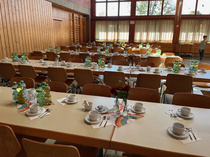 Im Anschluss ging es in die Festhalle, wo die Feierlichkeiten fortgesetzt wurden. Nach einer Willkommensrede von Frau Ruf wurden die Erstklässler unter größter Anstrengung und Aufregung der Zweitklässler mit einem Theaterstück begrüßt. Das gemeinsame Singen aller Schüler gehörte natürlich ebenso dazu. Nachdem die Erstklässler ihre Paten erfahren hatten, ging es durch das Spalier zum ersten Mal gemeinsam ins Klassenzimmer. Nach der ersten Aufgabe gab es ebenso die obligatorischen ersten Hausaufgaben und danach ging es zum Feiern mit Kaffee und Kuchen zurück in die Festhalle.