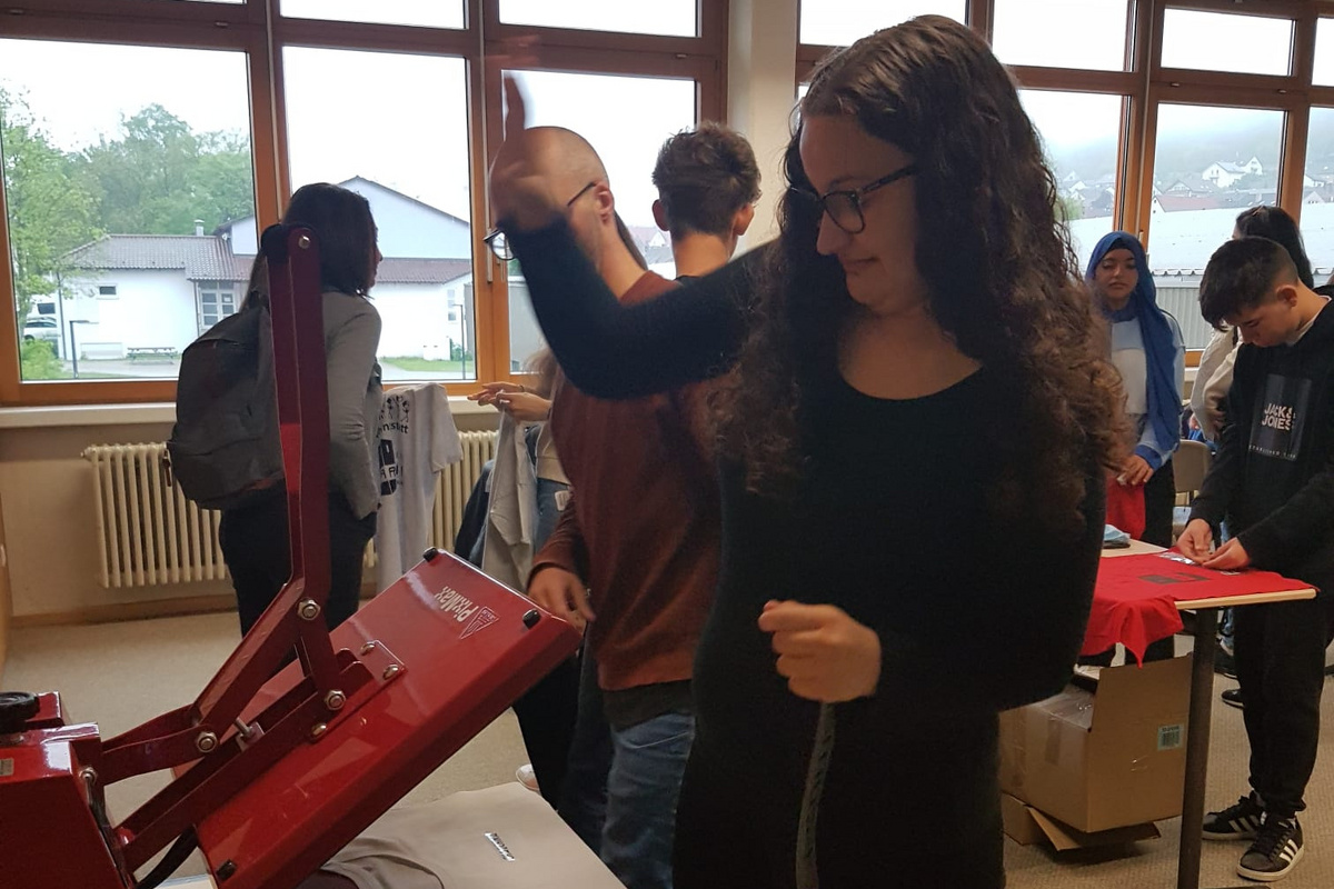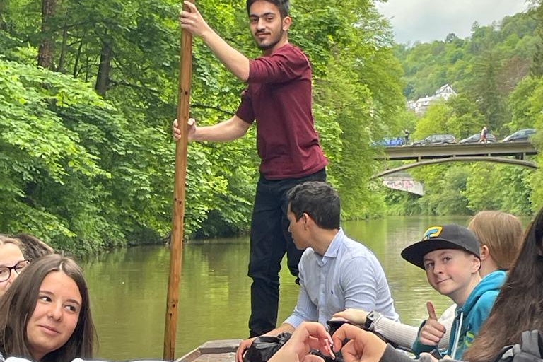 Nachmittags standen dann in Tübingen Sightseeing und Stocherkahn fahren auf dem Programm. Der Dienstagvormittag begann in der Gemeinschaftsschule mit dem individuellen Gestalten von T-Shirts und dem anschließenden Bedrucken mit der schuleigenen Druckermaschine unter Anleitung von Joaquim Teixeira. Es folgte ein von Pascal Linzner durchgeführter Workshop zum Thema Bionik, in dem die spanischen Schüler*innen mit ihren deutschen Austauschpartner*innen eine Blüte so gestalteten und programmierten, dass sich diese durch verschiedene Reize öffnen und schließen ließ. Danach arbeiteten die Schüler-Austausch-Paare an einem digitalen Tagebuch, mit dem Programm Taskcards, über die gemeinsame Zeit in Chauchina. Mit Käsepätzle und grünem Salat gestärkt, schloss der Tag mit einer Rallye durch Calw, ergänzt durch die Informationen aus der „future history app“, die von der Stadt Calw angeboten wird. Den Mittwoch verbrachten wir im Freizeitpark Tripsdrill (und testeten Filmtrick Apps. Dort genossen wir schwäbische Snacks wie Fleischkäsweckle und hatten viel Spaß.