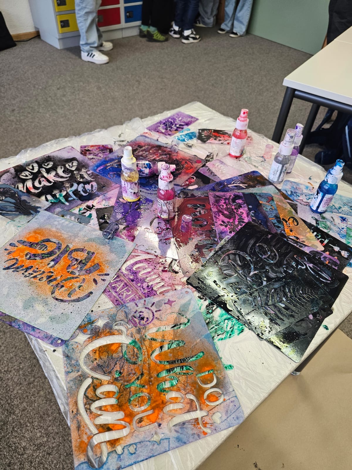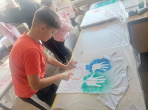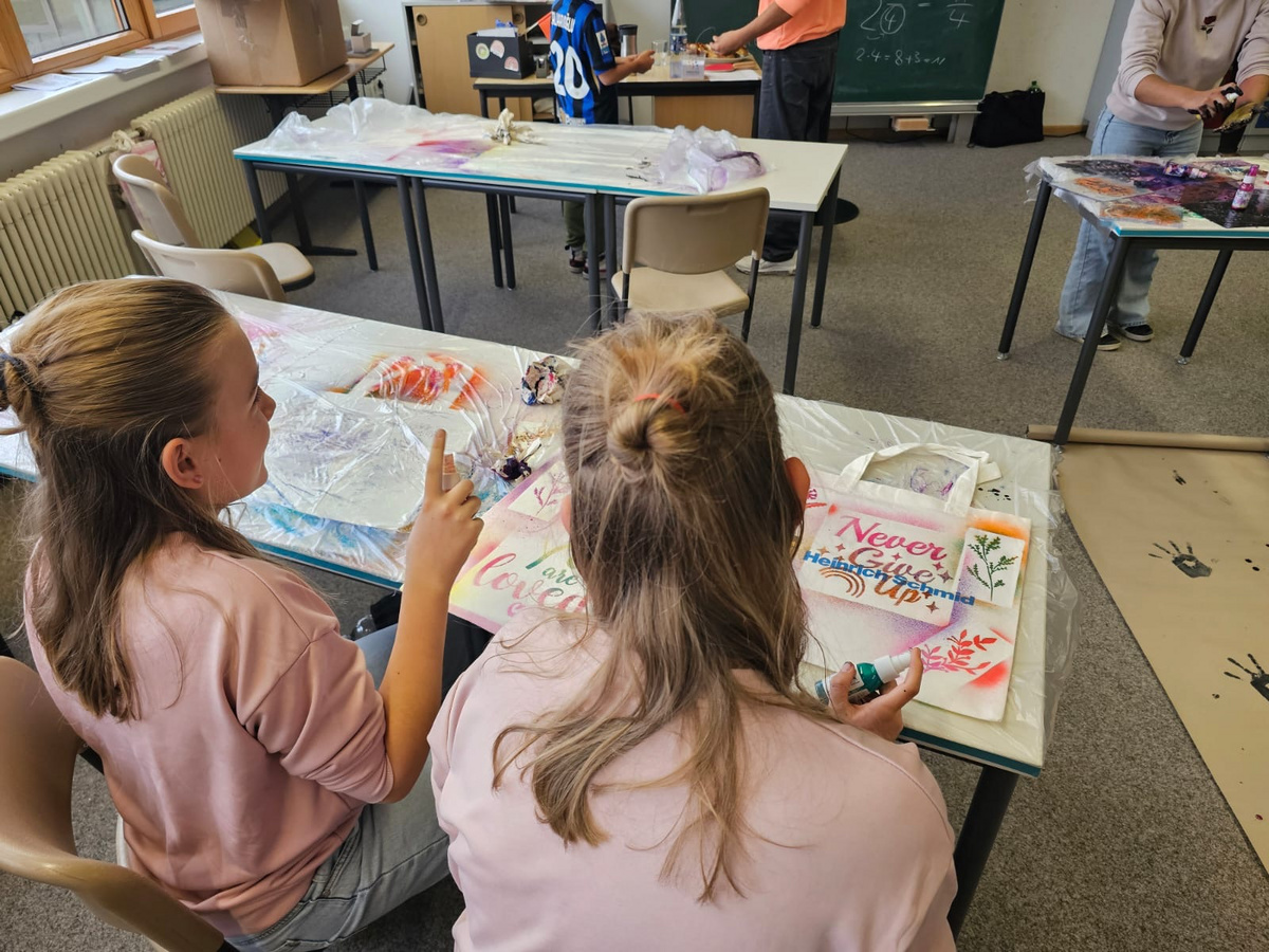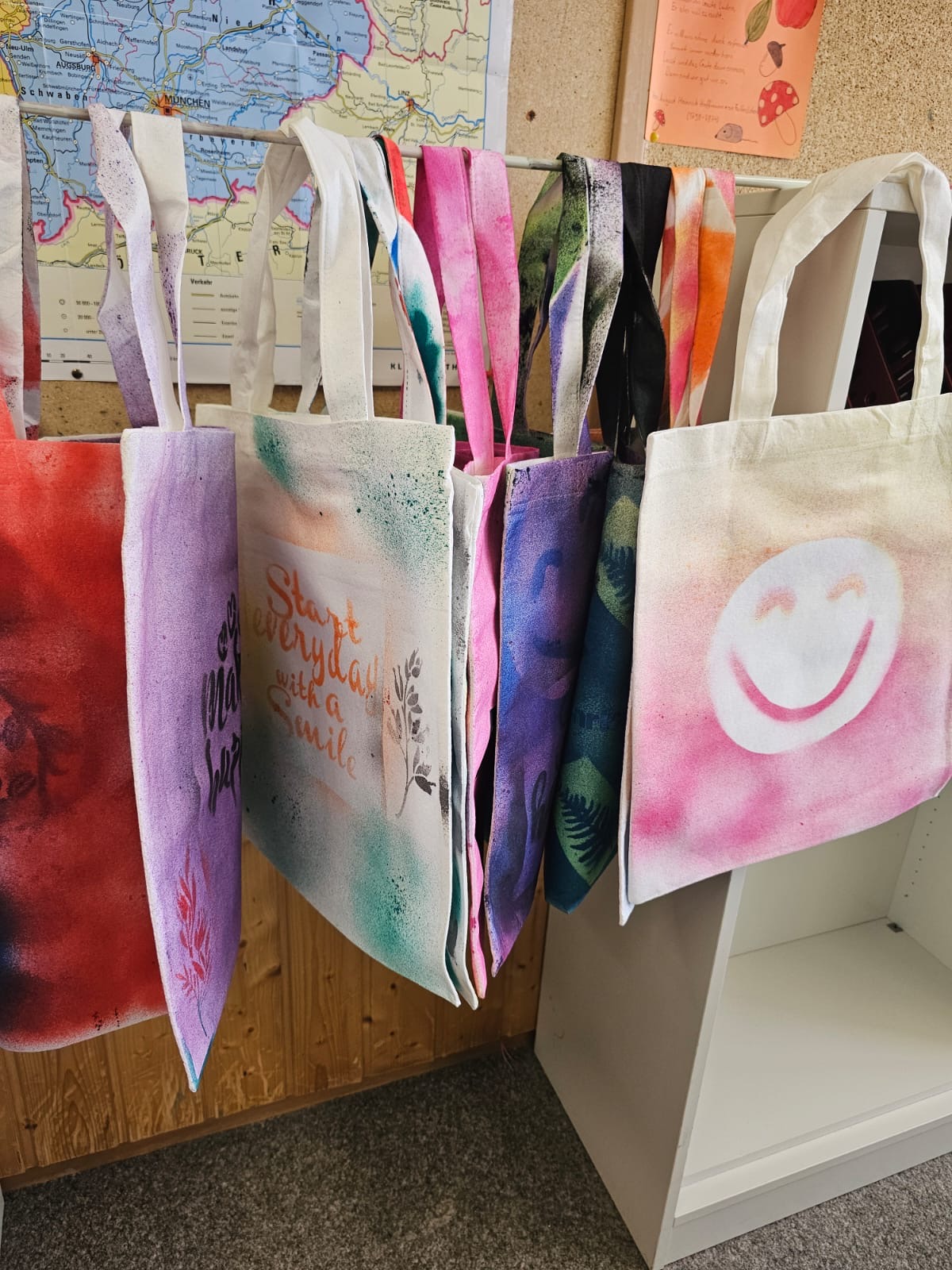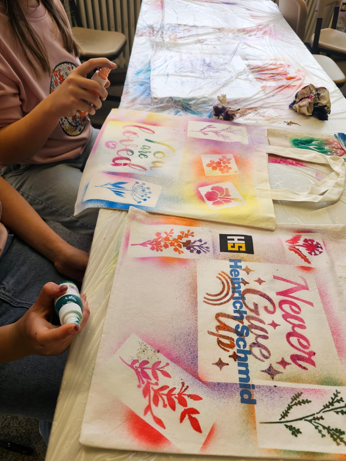 Die Schülerinnen und Schüler gestalteten mit Sprühfarbe T-Shirts und Taschen und hatten dabei sehr viel Freude. Die Ergebnisse sind super geworden!