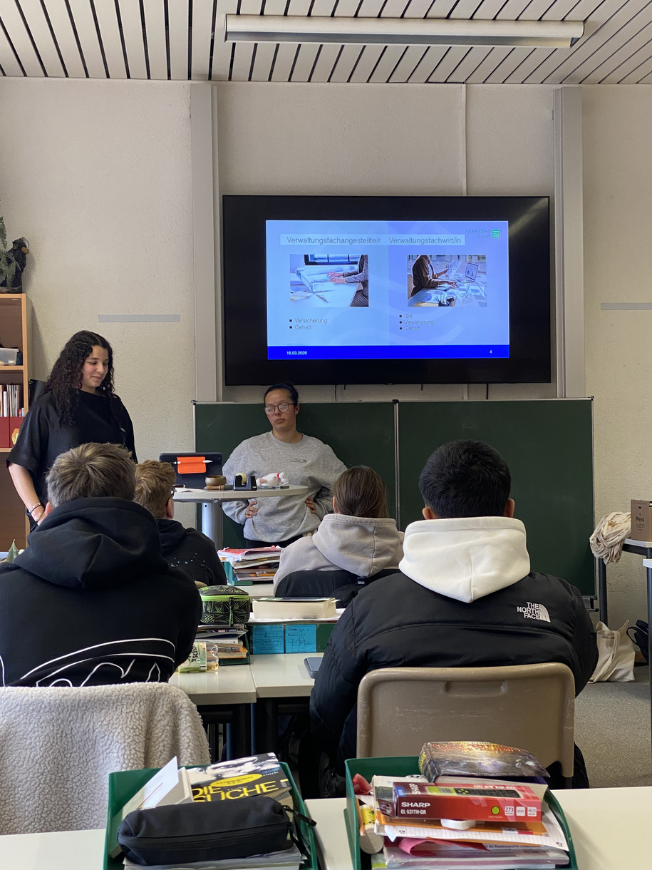 Besonderen Besuch erhielten die 8. Klassen: Zwei ehemalige Schülerinnen unserer Schule stellten ihren Ausbildungsberuf **Verwaltungsfachangestellte/r** vor. Im Rahmen der Berufsorientierung berichteten sie aus erster Hand von ihrer Ausbildung sowie von ihrem Arbeitsalltag in der Verwaltung.